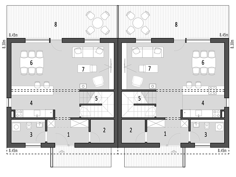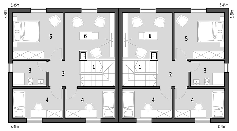 Na prvom katu nalazi se dnevni boravak, spavaći blok s tri spavaće sobe i kupaonica. Ovaj tip kuće namijenjen je obiteljima koje traže udobnost i privatnost.